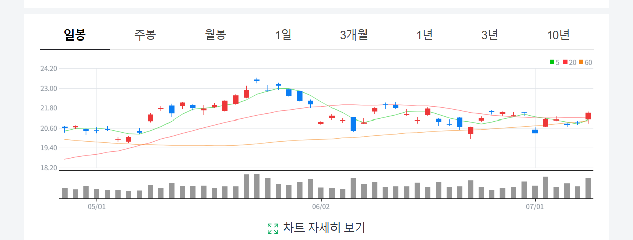 - 📊 거래량 증가 (반등 시): 7월 3일 ($21.15, +2.37%)과 7월 4일 ($21.56, +1.94%) 상승 시 거래량이 이전보다 증가하며 매수세가 붙는 양상입니다.